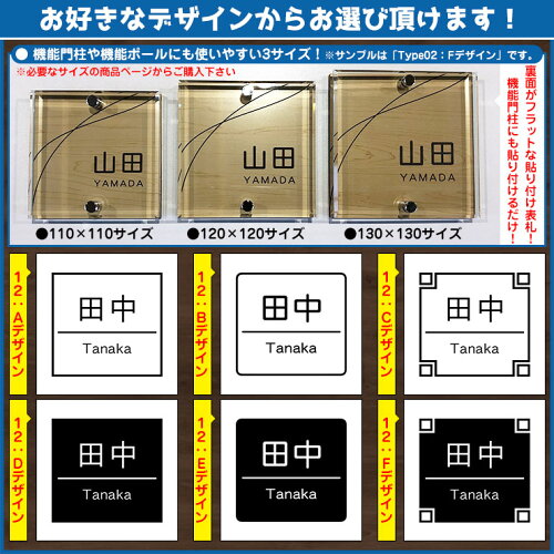 アクリル表札 ネームプレート 二層板表札 クリスタル Type12:2点ビス仕様【110×110mm】 機能ポールや平らな面に貼るだけで使える便利な表札! 販売条件 ◆詳しくはこちらをご確認ください サイズ W110×H110×T26mm 約190g カラー カラーサンプルをご確認ください 仕様 表札(取付可能場所:郵便ポスト・機能門柱・機能ポール・門扉・ガラス・扉・その他凹凸の無い場所) デザイン:6種(文字数やデザインにより文字位置や文字サイズが多少異なります。
